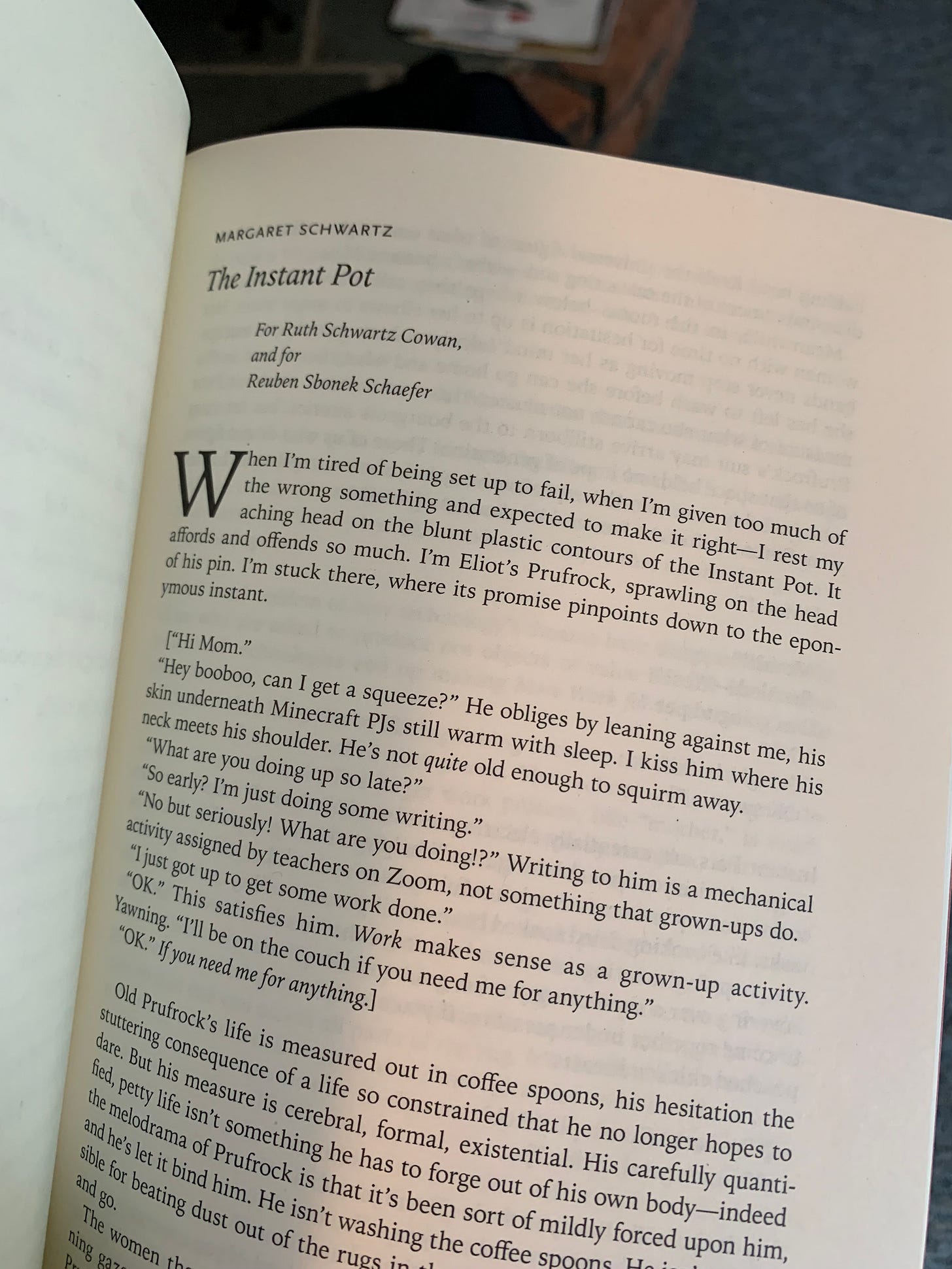 The essay is about the Instant Pot, and also somehow about T.S. Eliot’s “The Love Song of Alfred J. Prufrock,” a poem I loved when I was sixteen. It’s also about trying to write in the very early morning of a gray November, when seven-year-old Reuben gets up and finds me and interrupts all my already-jangled streams of thought with the burbles and chirps of his inimitable existence. That relation, that tension, is at the heart of the essay— the pull towards a loved one and the push away into the life of the mind, and the envy and rage of someone like Eliot’s Prufrock, who thinks himself a Hamlet of the drawing room because he’s awash in his own interiority. What a refuge, and a privilege, that interiority; yet how delightful, the weight of this small boy in his still sleep-warm pyjamas, pressing into my side.